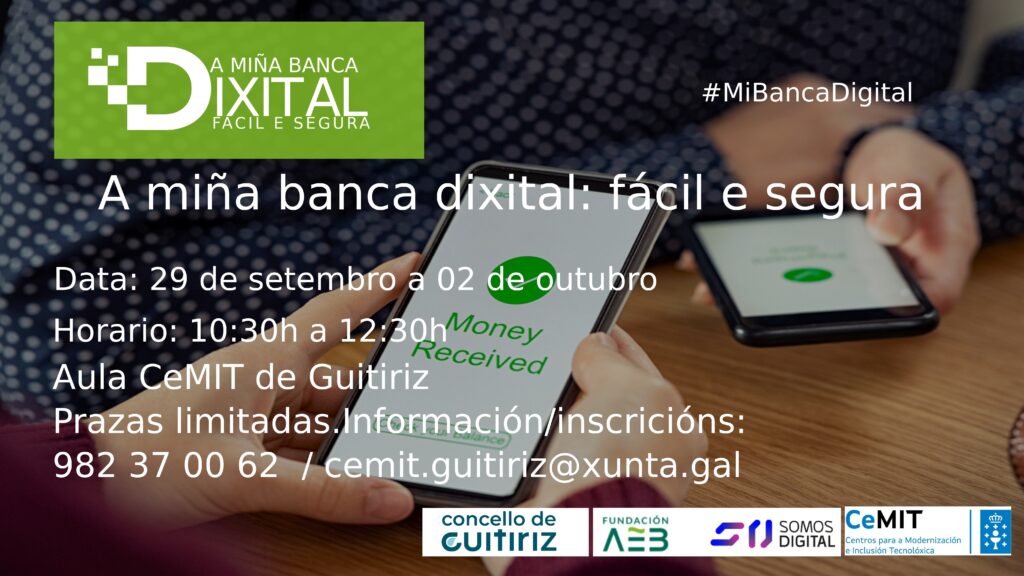 A Aula CeMIT do Concello de Guitiriz organizará a partir do vindeiro luns, 29 de setembro, unha formación gratuíta sobre banca dixital, destinada a achegar á cidadanía os coñecementos básicos necesarios para utilizar con seguridade e confianza os servizos habituais da banca electrónica, así como o manexo dos caixeiros automáticos. Esta formación estenderase ata o 2 de outubro e realizarase en horario de 10:30 a 12:30 horas.