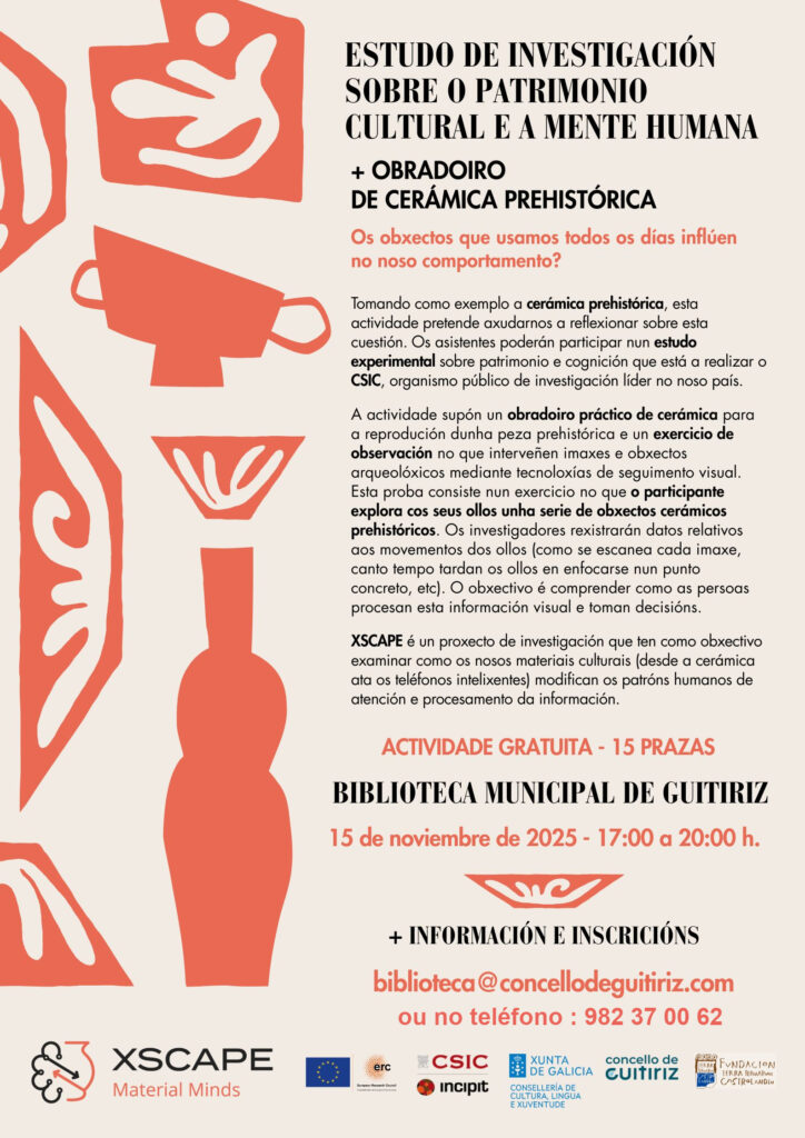 Este proxecto, de carácter científico e divulgativo, céntrase na relación entre o patrimonio cultural e a mente humana. As persoas participantes poderán formar parte dun obradoiro práctico de cerámica prehistórica, no que se reproducirá unha peza antiga, e nun exercicio de observación con tecnoloxías de seguimento visual.