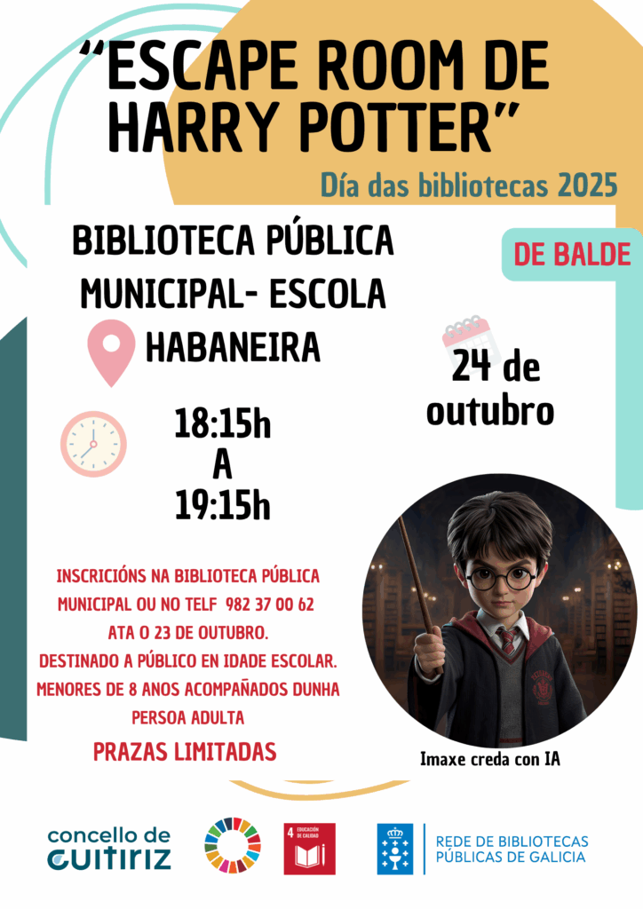 A Escola Habanera do Concello de Guitiriz conmemora o Día das Bibliotecas 2025 cunha actividade especial: un escape room titulado ‘Misterio no laboratorio de Hogwarts’, inspirado na famosa saga de Harry Potter.