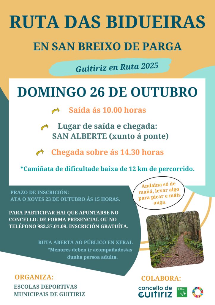 O programa ‘Guitiriz en Ruta’, organizado polas Escolas Deportivas Municipais coa colaboración do Concello de Guitiriz, continúa este domingo, 26 de outubro, coa Ruta das Bidueiras, que transcorrerá pola zona de San Breixo de Parga.
